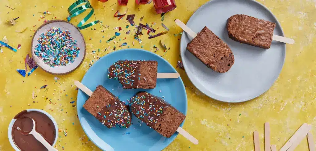 הבראוניז הכי חגיגיים שיש! בראוניז שוקולית על מקל רכים ושוקולדים, עם ציפוי שוקולד דק וסוכריות צבעוניות שהופכות אותם לחגיגה של ממש.
