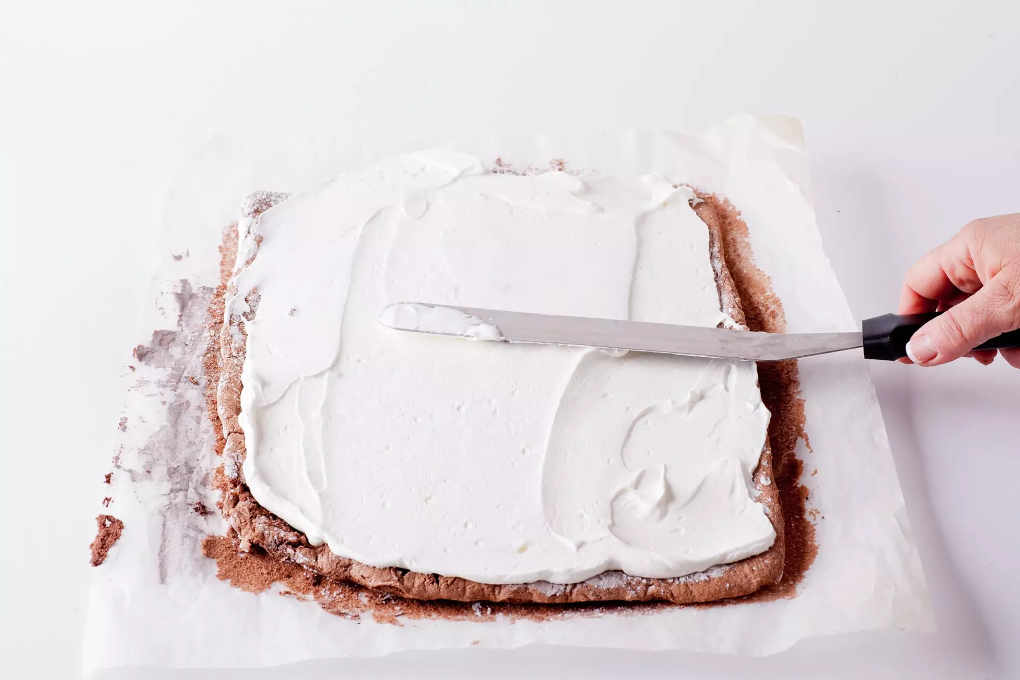 - פותחים את הרולדה ומסירים את הנייר בזהירות. מורחים כמחצית מהקרם על יריעת הבצק ומגלגלים שוב. מצפים ביתרת הקרם ומאחסנים במקרר כ-3 שעות לפני ההגשה.
