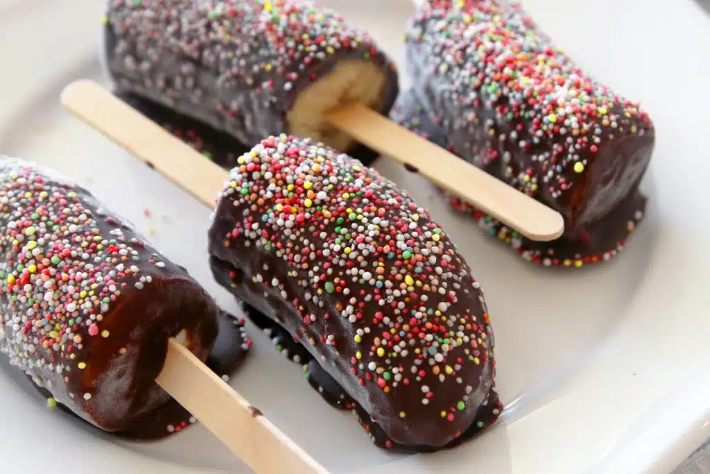 - נועצים מקל ארטיק בתחתית כל חצי בננה ומניחים על גבי צלחת. מקפיאים למשך כמה דקות.