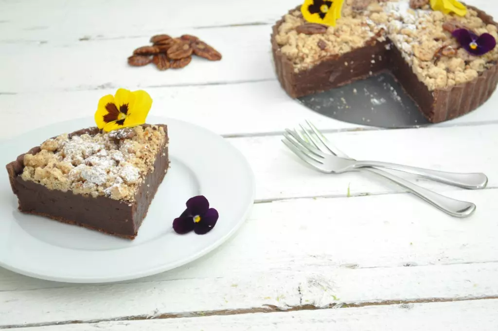 טארט שוקולד טעים במיוחד עם קלתית קקאו, מילוי עשיר של קרם שוקולד וקראמבל פקאן פריך. מתכון של מיקי שמו מתוך התוכנית "מיקי שמו עושה בית ספר" עונה 2 בהפקת ערוץ האוכל