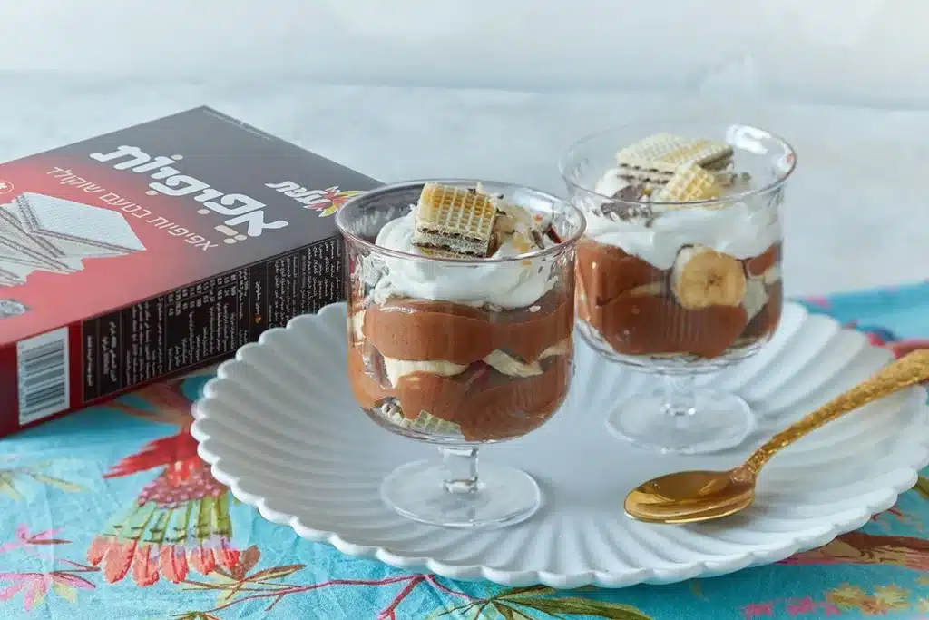 - מניחים בכל כוס שברי אפיפיות, קרם שוקולד מריר ופרוסות בננות. ממשיכים בסדר הזה עד שמגיעים ל-3/4 מגובה הכוס.