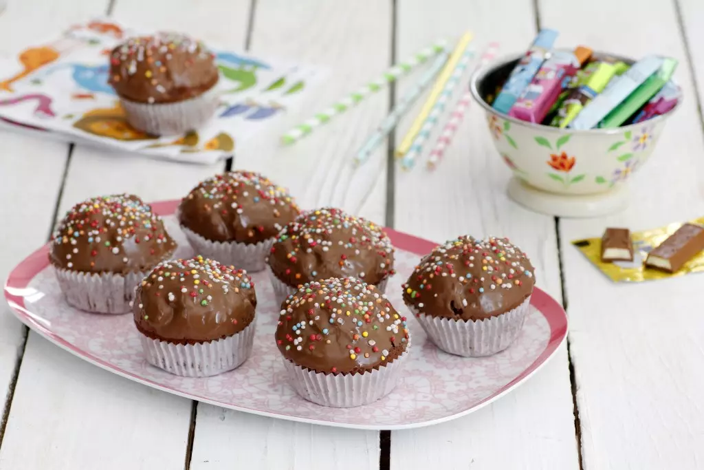 - טובלים את החלק העליון של כל עוגה בשוקולד המומס, מקשטים בסוכריות ומגישים.