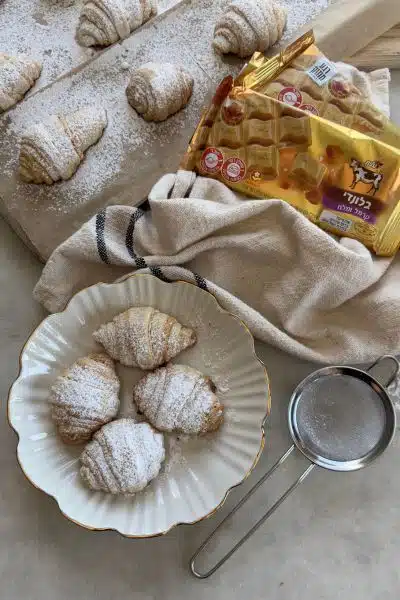 שכבות דקות של בצק פריך שאפילו לא חייבים בשבילו מיקסר (אפשר להכין ידנית) מלית מושלמת של שוקולד בלונדי ושקדים, ויש לכם עוגיות רוגעלך בלונדי.