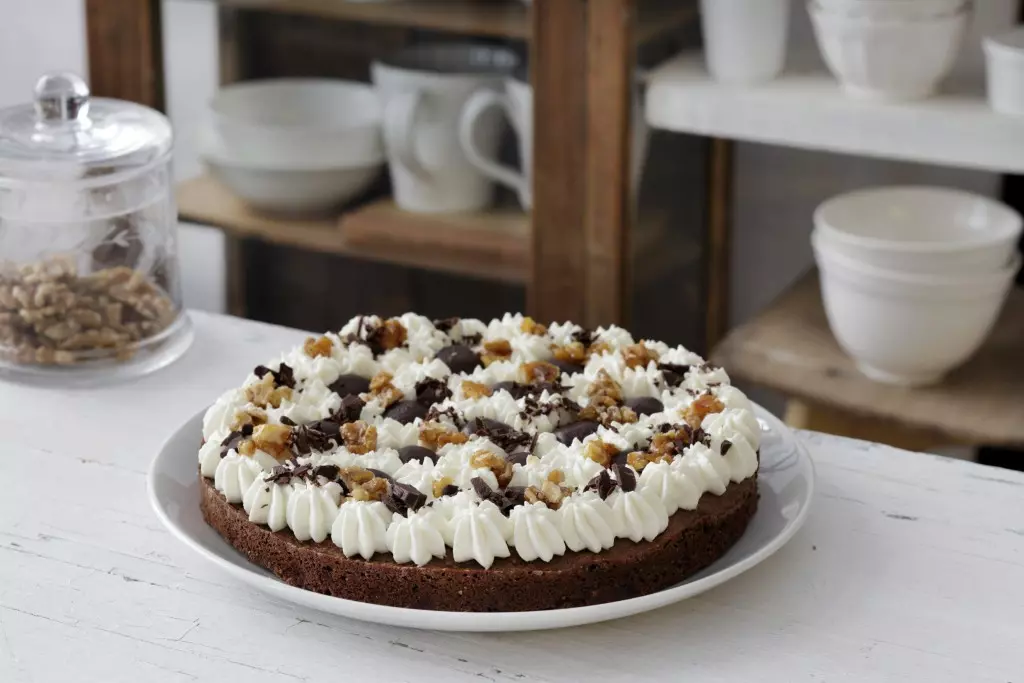 עוגת בראוני עם קצפת, טראפלס ואגוזים מקורמלים