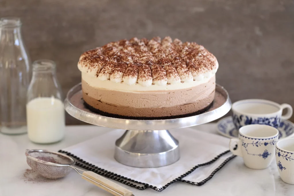 - מקציפים את המסקרפונה יחד עם השמנת המתוקה ואבקת הסוכר לקצפת יציבה. מעבירים לשק זילוף עם פייה חלקה בקוטר 1.5 ס"מ, מזלפים עיגולים על גבי העוגה, מנפים מעל מעט אבקת קקאו ומגישים.