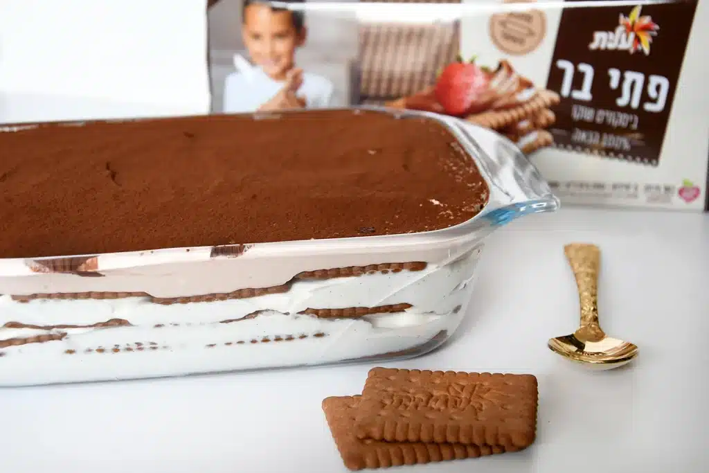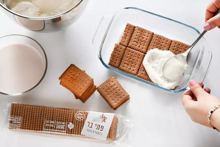 מורחים מעל הפתי בר 1/3 מכמות הקרם וחוזרים שוב על שכבות הפתי בר. חוזרים על השכבות 3 פעמים ומסיימים בפתי בר. מעבירים למקרר.