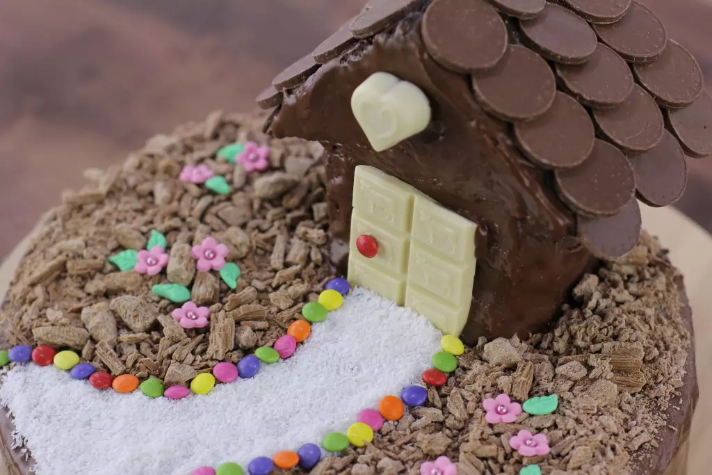 - מקשטים במקופלת מגוררת, יוצרים שביל מקוקוס טחון ועדשים. מכינים גג ממטבעות שוקולד ודלת וחלונות מקוביות שוקולד לבן.