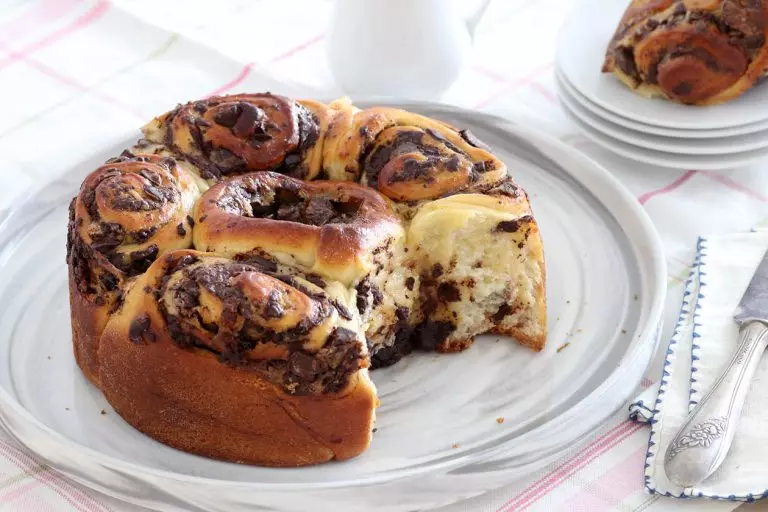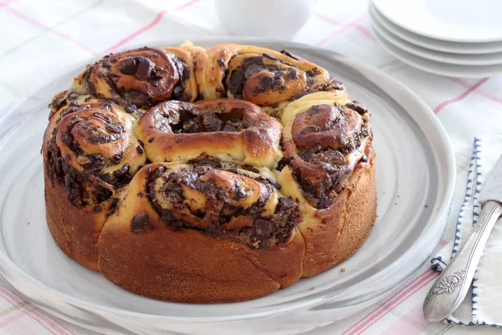 מרדדים כל חלק על גבי משטח מקומח קלות למלבן בעובי של כ-1/2 ס"מ ומורחים חצי מכמות המלית בשכבה אחידה. מפזרים חצי מכמות השוקולד צ'יפס. - מגלגלים לרולדה הדוקה וחותכים לשושנים בעובי של 5-6 ס"מ.
