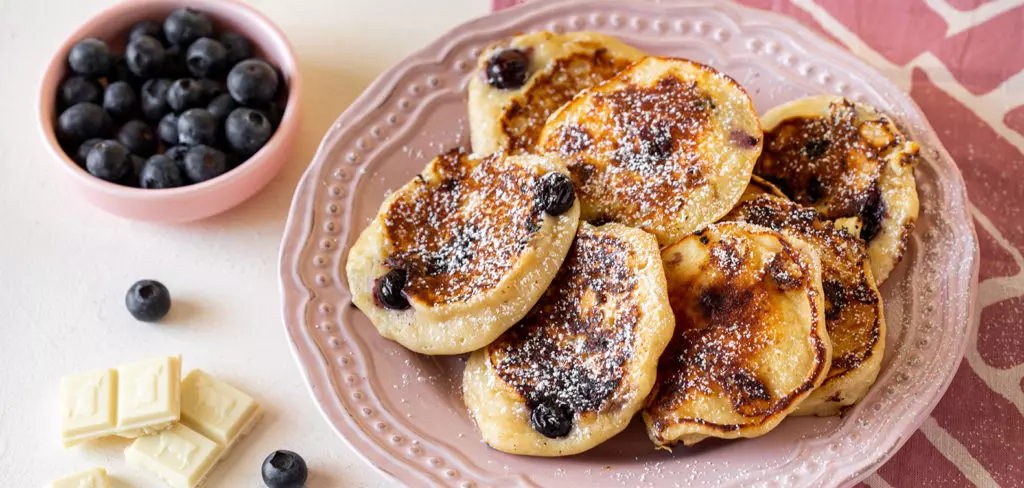 פנקייק גבינה שילדים אוהבים במיוחד עם תוספת של אוכמניות וצ'אנקים של שוקולד לבן וללא תוספת סוכר - מתכון מעולה שמכינים בקלות ובמהירות