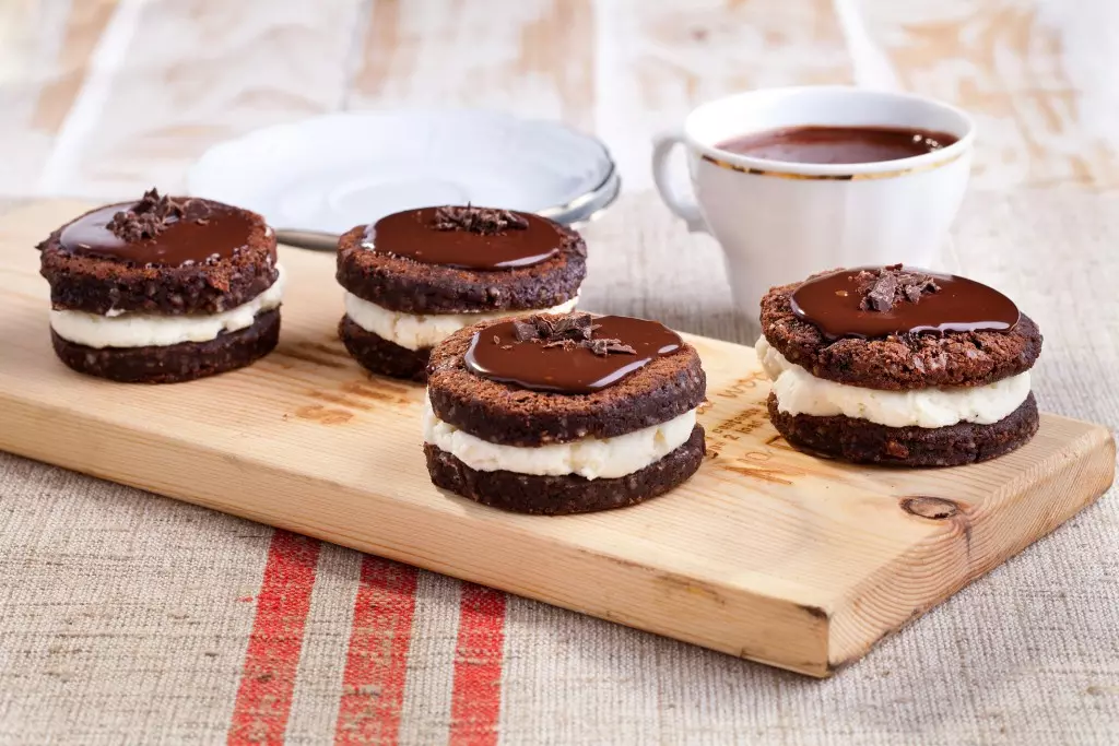 - מעבירים את המלית לשק זילוף. מזלפים את הקרם על מחצית מהעוגיות, מכסים בעוגיות הנותרות. ומגישים.