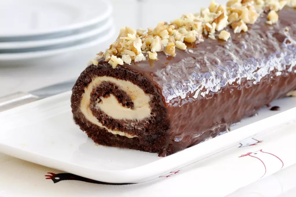 - יוצקים את הציפוי על גבי הרולדה, מקשטים בבוטנים או אגוזים קצוצים ומגישים.