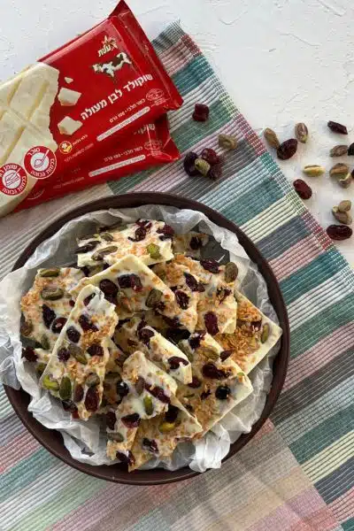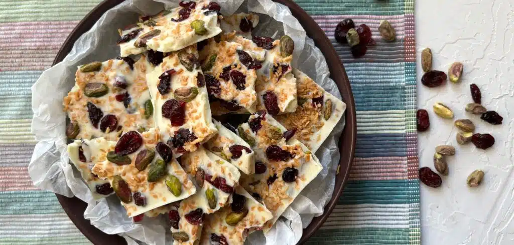 שברי שוקולד פרה לבן עם פיסטוקים, קוקוס קלוי וחמוציות שאי אפשר להפסיק לאכול!